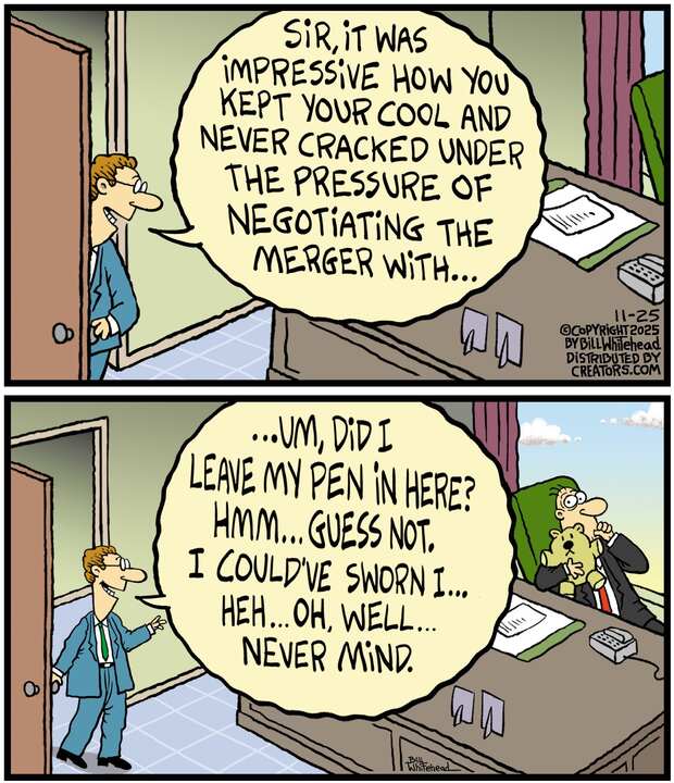 Bill’s career in cartooning started in the fifth grade, when he would copy drawings from comic strips, the New Yorker magazine and editorial cartoons. After a while he developed his own style, focusing primarily on the drawing. He soon realized his characters would need something to do and say, so he gave them their own odd little world to live in. Soon everyone around him became fair game. By college, Bill was cartooning for the school paper. Later, he created posters for book and record stores and freelanced for the Saturday Evening Post, Advertising Age, the Boston Phoenix, Wall Street Journal and King Features. In the '80s, he syndicated Sidelines, a sports panel cartoon.