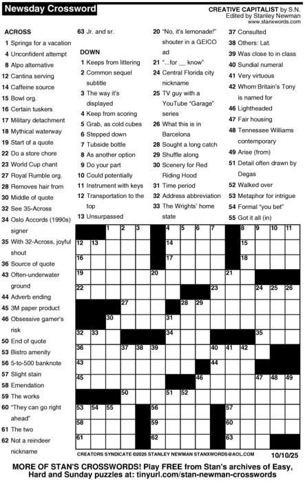 Because free access to the content of Newsday.com is available only to Newsday subscribers and customers of Cablevision (Newsday’s owner), many thousands of puzzle fans, spanning six continents, get the Newsday Crossword free every day right here at Stan’s Crossword Land.