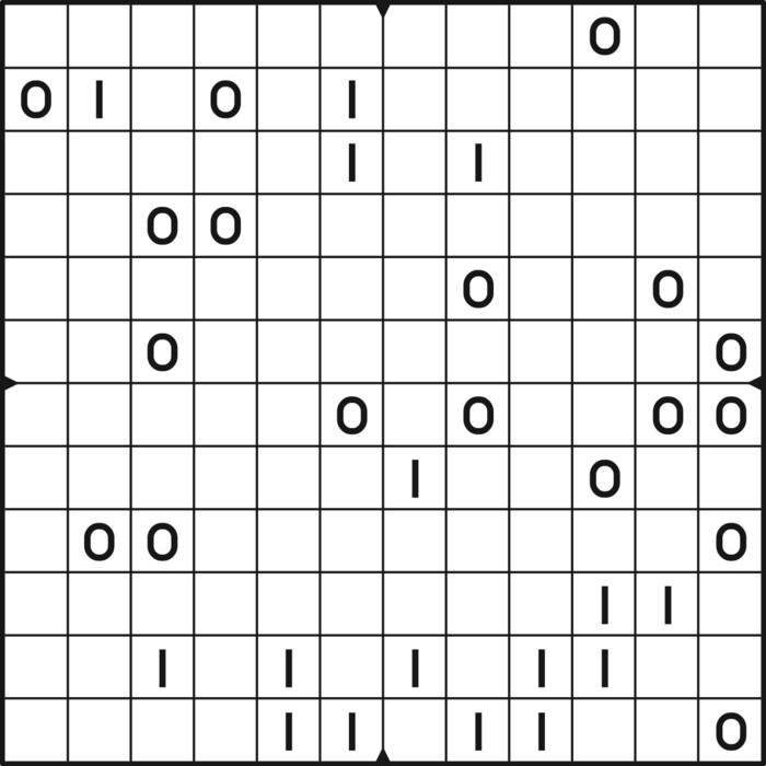 A daily binairo puzzle! Solve each puzzle with only 0's and 1's. Remember: No more than two the same numbers may be placed directly next to or below each other. Every row and every column must contain as many zeroes as ones. The combination of zeroes and ones in every row must be unique, as does the combination in each column.