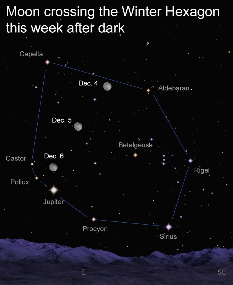 Watch for the full moon to enter the Winter Hexagon on the night of Dec. 4, when it appears about midway between the stars Aldebaran and Capella. The next night, though, you'll notice that it has moved considerably eastward, and by Dec. 6 you'll see it quite close to Castor, Pollux and Jupiter, before it leaves the Hexagon behind on the 7th.